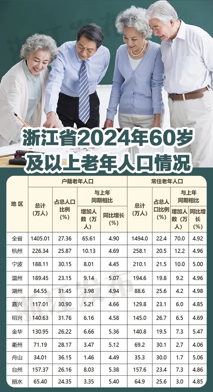 日前,省老龄工作委员会办公室发布《2024年浙江省老年人口和老龄事业统计公报》。