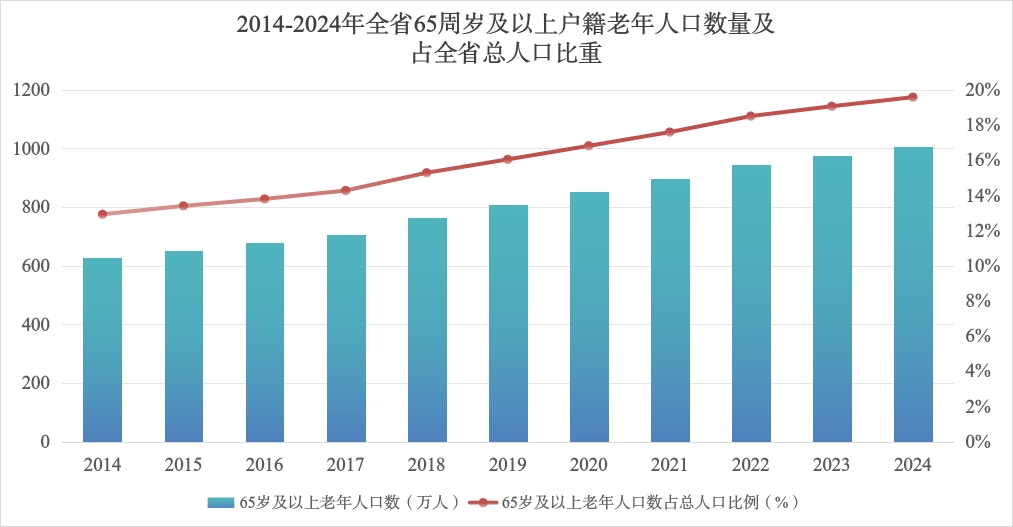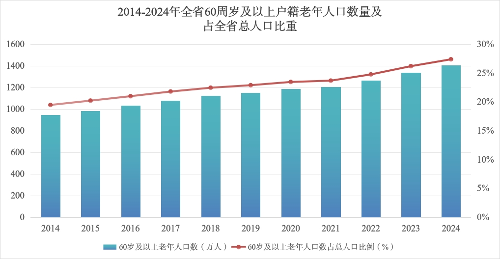 2024年末,全省60岁及以上常住老年人口1494万人,占总人口的22.40%,比上年同期增加70万人,同比增长4.92%;65岁及以上常住老年人口为1048万人,占总人口的15.71%,比上年同期增加27万人,同比增长2.64%。