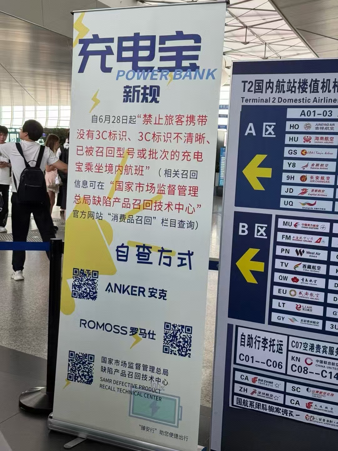 为帮助旅客顺利出行,机场安检口、值机柜台、安检通道等多处已设置醒目的提示标识,详细说明充电宝携带新规:一看有无3C标识,二看是否属于被召回型号或批次的充电宝(罗马仕、安克等品牌部分型号),旅客可以通过二维码扫码自查,确认所持充电宝是否合规。