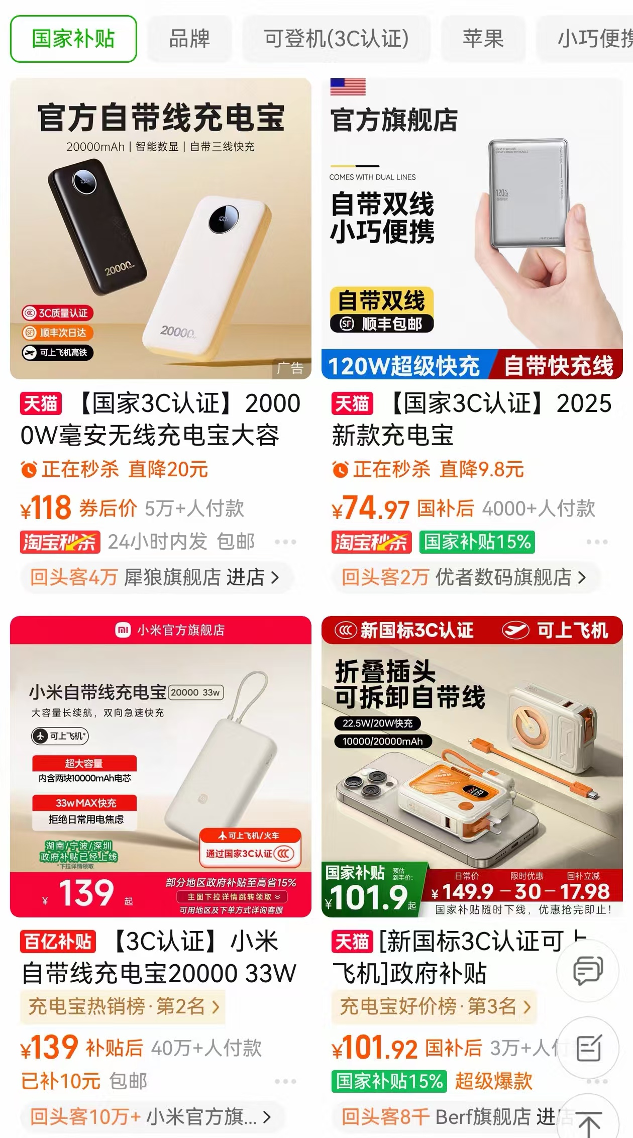 在各大网购平台上,“通过国家3C认证”和“可携带上飞机”成为充电宝产品最引人注目的卖点。部分品牌在直播销售时打印3C证书展示,强调产品合规性,引导消费者截图保存以备安检。