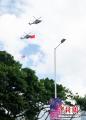 香港特区政府飞行服务队直升机悬挂国旗和特区区旗飞临金紫荆广场上空。
