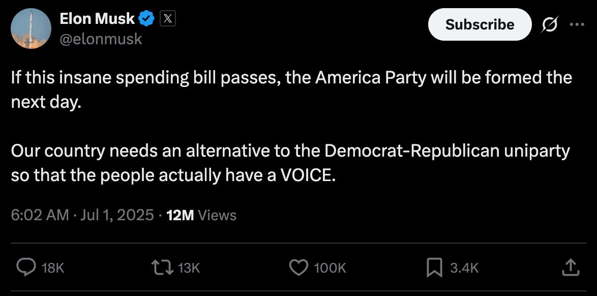 马斯克还用侮辱性词汇形容共和、民主两党,称“大而美”法案将创纪录地把债务上限推高5万亿美元。“是时候成立一个真正关心人民的新政党了”。
