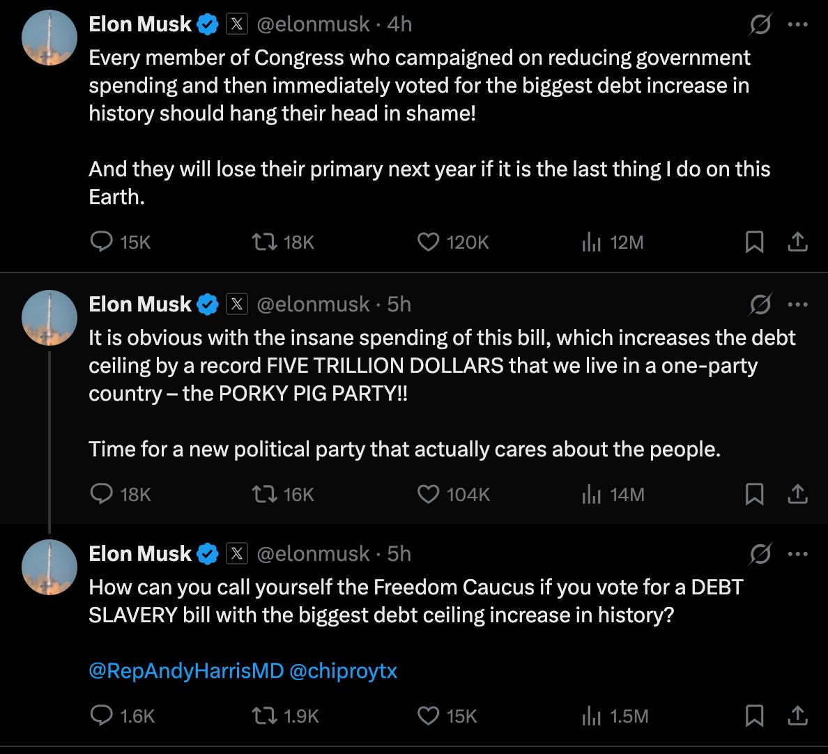 马斯克说:“每一个竞选时承诺削减政府开支,却转头就投票支持史上最大债务增长法案的国会议员,都应该感到羞愧!如果我在这个地球上(有要)做的最后一件事,那就是让他们明年(国会中期选举时)输掉党内初选。”