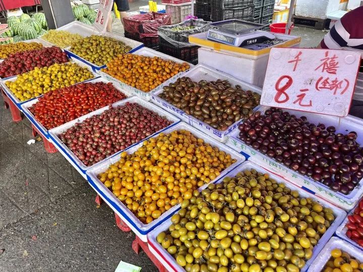 查了下,这种五颜六色的小番茄今年非常流行,很多地方都在卖,不只菜场,超市、水果摊也有卖。有的还会取个非常好听的名字,比如马卡龙小番茄、七彩小番茄……