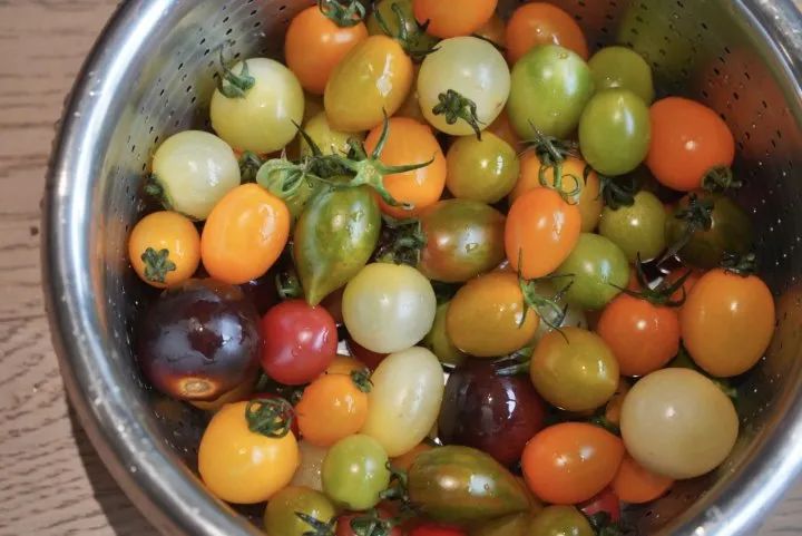 步入盛夏,番茄也进入了收获的季节。一盘盘五颜六色的小番茄依次排开,红的、绿的、紫的、棕的、黄的、橙的、白的……不知道的,还以为谁家颜料盘打翻了。