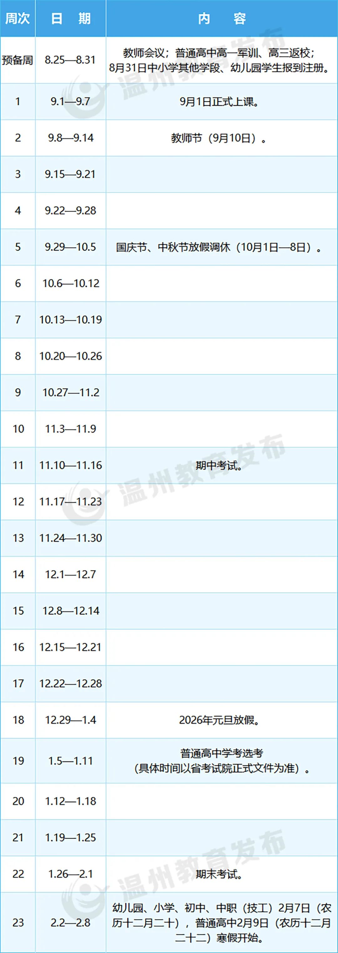 今天,温州市教育局公布了2025学年第一学期行事历(2025年8月—2026年2月),一起跟随小编去看看吧!