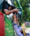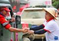 7月3日,在贵州省榕江县,一名救援队员在撤离时与当地居民握手道别。