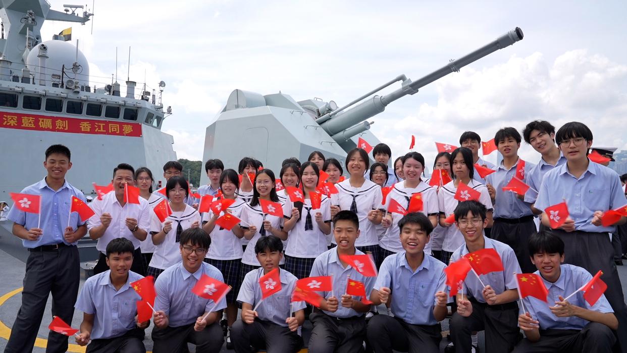 7月3日,中国海军山东舰航母编队抵达香港。这是香港中学生登上海军运城舰参观、留影。新华社发(段振军 摄)