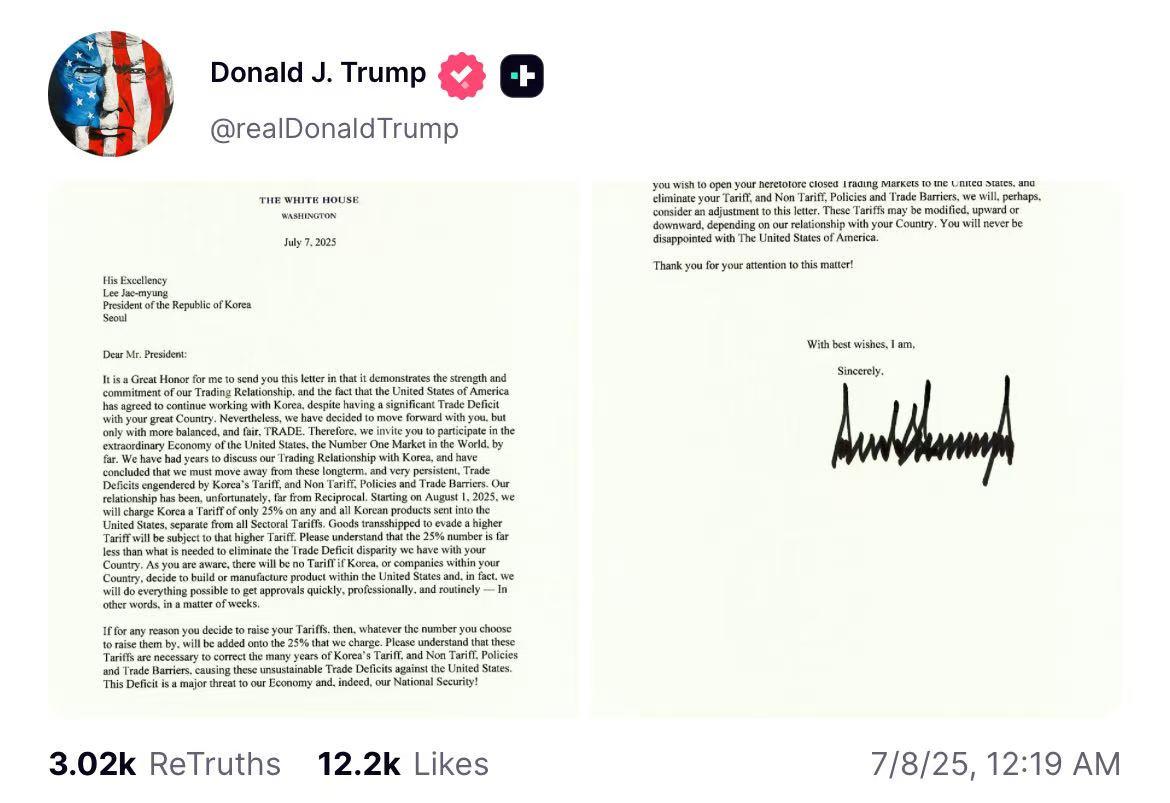 特朗普警告称,如果日韩两国以提高关税作为回应,美国也将在25%的基础上再提高同等额度的关税。