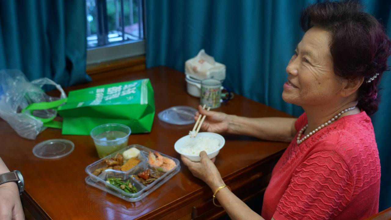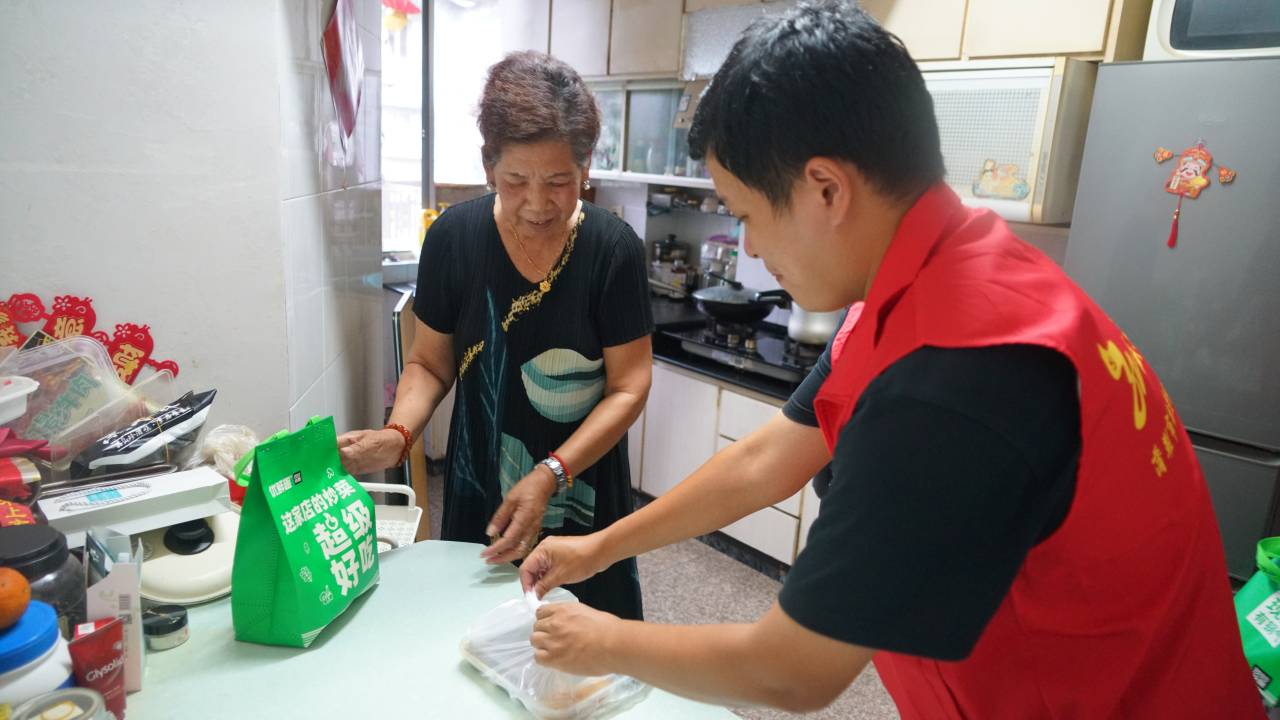 “小华阿姨,我们来给你送饭了,快趁热吃!”芳园社区党委副书记夏大卫和社区干部们敲开了居民高小华家的门,将刚从社区邻里食堂打好的饭菜递给了她。牛肉炖土豆、温州鱼饼、炒青菜、黑椒牛排,再加上一碗清热解暑的绿豆汤,高小华阿姨吃得津津有味,连声道谢:“今天风大雨大,你们还专门跑一趟,太有心了!”