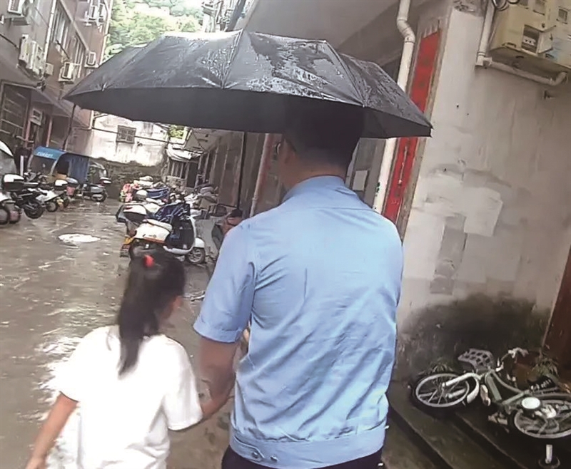 “台阶有水很滑,叔叔抱你。”周义雨弯腰将女孩抱起,带她坐上警车寻找家人,警车七拐八绕穿过数条幽深小巷,终于驶近女孩家所在的巷口。