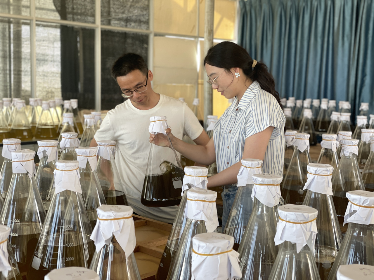 省海洋水产养殖研究所正高级工程师方军告诉我们,养好泥蚶“幼崽”,必须精心调配“奶粉”——它们的饵料单胞藻。在这里,一排排三角烧瓶里培育着不同生长阶段的藻类。“我们设计了智能化设备,每天定时摇晃20次,确保藻类生长均衡。”方军说着开启了设备。