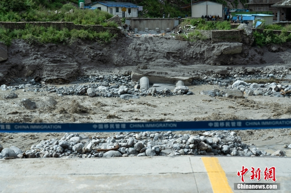 7月 9日,西藏自治区日喀则市吉隆口岸一带道路被洪水淹没。7月8日5时许,吉隆口岸一带东林藏布河河水暴涨,导致中国一侧11人失联。山洪灾害发生后,当地启动应急响应,全力开展人员转移安置工作。截至9日,受到影响的300余名人员已全部得到妥善安置。中新社发 蒋美灵 摄