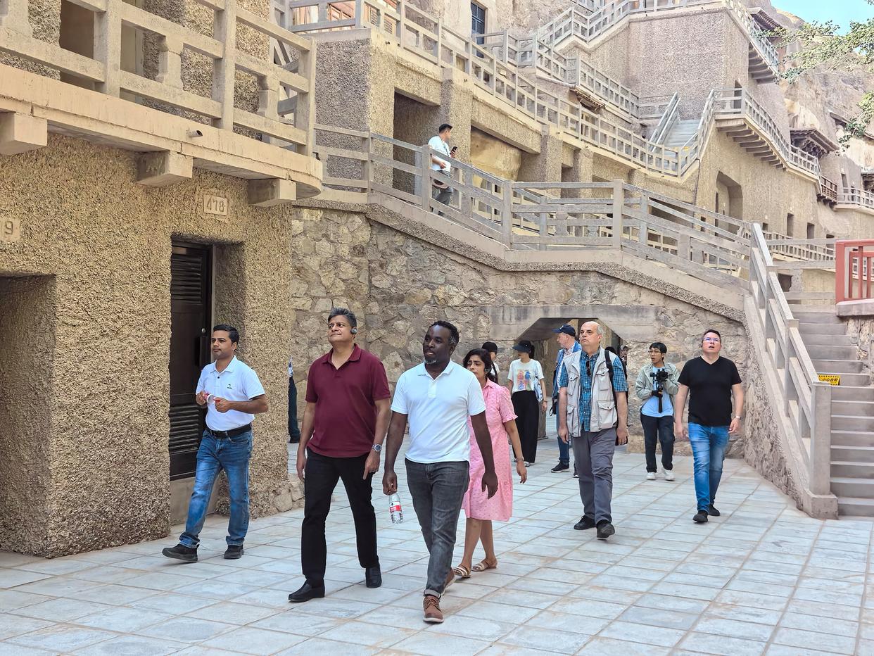 7月8日,参加全球文明对话部长级会议的嘉宾在甘肃参观敦煌莫高窟。新华社记者 任延昕 摄