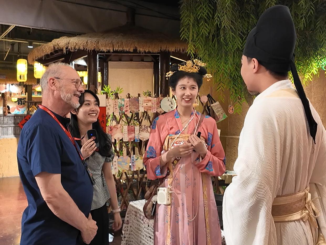陕西西安,外宾在长安十二时辰主题街区品唐食香浓,习独具风韵的“叉手礼”,沉浸于繁荣的盛唐气象;