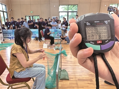 与此同时,另一边补网操作比赛引来了阵阵喝彩。一位渔嫂手持梭子上下翻飞,几乎在3分钟内就补好了5排共65个网眼。围观人群中,年轻的“渔二代”刘雪霞向记者解说起了比赛:“这项技术对渔嫂来说是常用的生存本领,而且实际作业中较比赛难度更大,因为被虾蟹破坏的网眼不规律,更考验手艺和经验。”