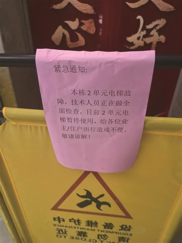 昨天下午,记者来到13幢2单元,看到涉事电梯已经停止运行,无法进入。其入口处设置了“设备维护中,请勿靠近”的警示牌。随后记者来到13幢1单元,该电梯目前正常运行,其中电梯维保标志显示今年6月24日、7月8日已例行保养。