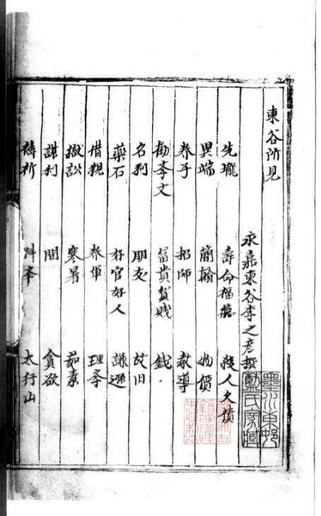 《东谷所见》又称《东谷随笔》,共一卷,凡三十则,涉及养子、招师、朋友、祷祈、狱讼、名利、异端、科举、理学、寒暑、富贵贫贱、好官好人等诸多社会话题和哲学思考。