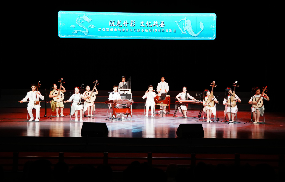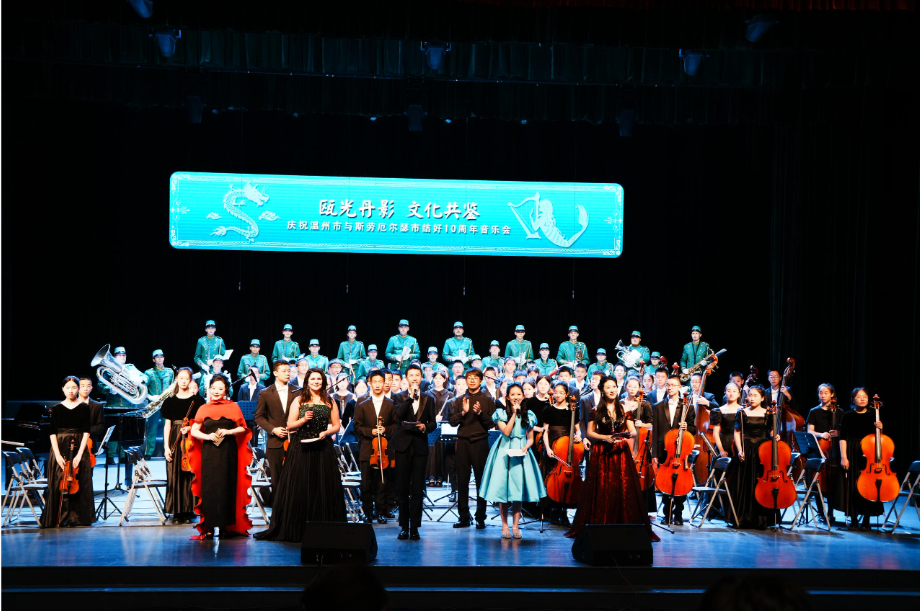 随后,温州“东道主”演员带来《声情咏叹》,展现英语歌剧、意大利语二重唱、德语咏叹调等西方经典艺术。温州市实验中学交响乐团奏响《诗人与农夫序曲》,为观众打开西方音乐之门。演出最高潮出现在两国乐团合奏《歌唱祖国》。熟悉的旋律将全场气氛推向了高潮,也动情诠释了“音乐无国界”。