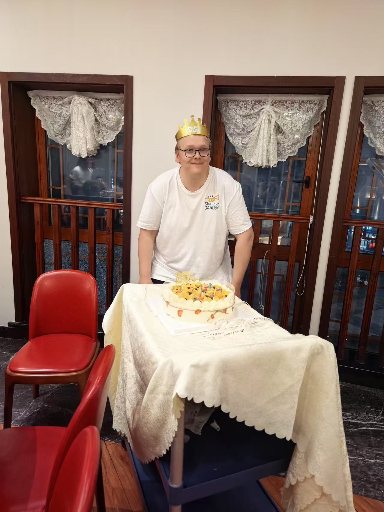 音乐会上,丹麦和温州学生共同创作的巨幅画作《双城记:从瓯江到哥本哈根》一并亮相,见证两国青少年的珍贵情谊。画作上有一个小蛋糕记录了一段暖心趣事。丹麦乐队刚来不久,恰逢一位19岁队员的生日,温州理工学院的志愿者特别准备了生日蛋糕。