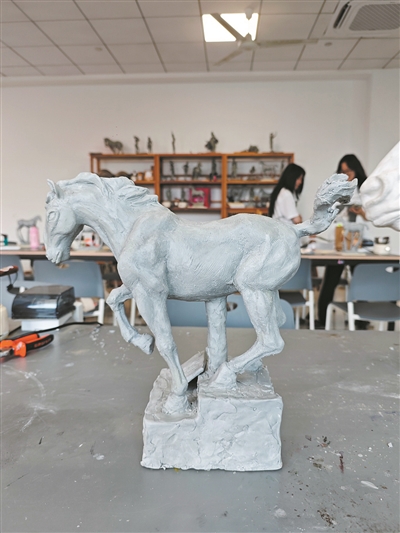 考上温州商学院后,周诗洋创作的第一件雕塑作品《马》,成为一段“磨出来”的珍贵记忆。“一开始,我想做人物雕塑,叶小鹏老师却建议我先试试动物雕塑。可那匹马总是立不起来,就像一摊软泥,怎么摆弄都不行。”他笑着用手比画着当时的情景,“叶老师让我先精读《动物雕塑技法》,再把书里的骨骼图仔细圈出来,让我一遍遍地琢磨、一遍遍地修改。那几个月,我沉浸在对这些知识的学习和实践中,不断地摸索、尝试。磨了数月,当那匹马终于稳稳地‘站’在桌上时,我突然明白了:艺术不是急出来的,而是熬出来的,它需要时间的沉淀和耐心的雕琢。”