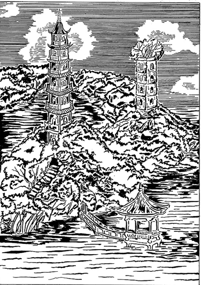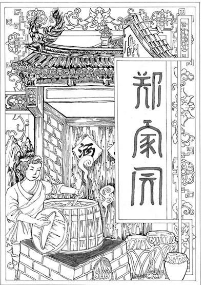 周诗洋同样也找到了属于自己的独特“感官密码”。去年,他为郑家园麦麦酒创作了一幅黑白招贴画。这幅画的背景纹样采用了中国传统的莲花四方连续纹样,典雅而富有韵味;中景选择了郑家园庄园的装饰,融入了具有地域特色的传统建筑元素,展现了郑家园麦麦酒深厚的文化底蕴和独特的地域风情;近景则聚焦于麦麦酒制作过程中的“蒸粮”步骤,生动而具体。从背景到中景,再到近景,营造出一种醇厚、经典的氛围,让人一眼就能联想到麦麦酒历经岁月沉淀的浓郁口感。这幅招贴画在2024年国青杯全国高校艺术设计作品展评中荣获学生组三等奖。他还用木版画的形式制作了江心屿的东西双塔,大胆拉开天空和湖面的对比。