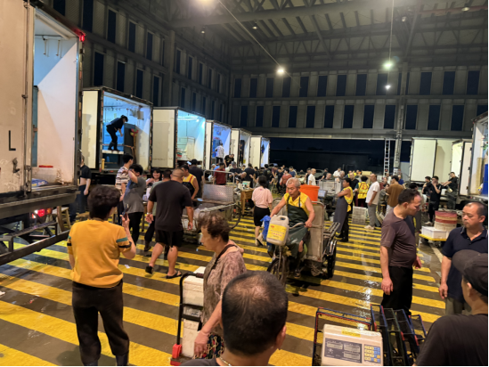 7月10日傍晚,记者在温州市水产批发交易市场看到,场内灯火通明,一辆辆满载活虾的运输车鱼贯而入,虾筐翻动间水花四溅。人群迅速围拢,询价声、过秤声此起彼伏。“快!这批山东九节虾刚到的,新鲜!”批发商老林一边招呼工人卸货,一边忙着回应老主顾的催促,他笑着对记者说:“价格这么实惠,货走得特别快,一车虾转眼就空了,忙得连汗都顾不得擦!”
