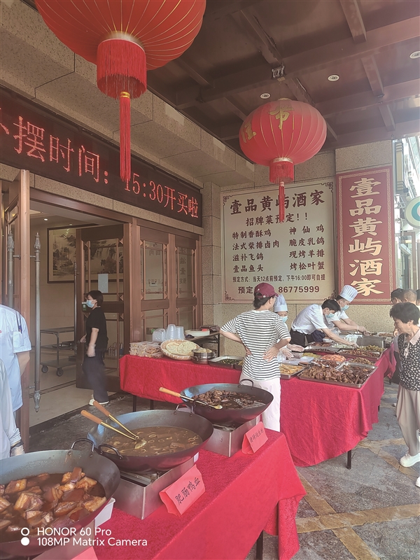 在龙湾区黄屿大道的“壹品黄屿酒家”前,猪蹄炖生地、酥排骨、红烧鲍鱼、卤猪耳朵、三黄鸡、鱼饼、毛豆炒萝卜条、山药炒芹菜等市民餐桌上的家常菜整齐地摆放着,大锅里是莲子猪肚汤、鸭血肥肠等菜品引人食欲,边上米筛里永嘉麦饼透着锅气。戴着白色防尘帽的厨师和服务员在前排为市民服务,市民驻足选购。这里的营业时间从下午3点半到晚上6点左右,营业额可达万元以上。前来购买菜品的蔡先生对记者说,“我也是前几天路过看到酒家门口有家常菜卖,价格不贵又是星级厨师做的,口感好,今天晚上来了朋友要喝一杯,所以买了几样卤食。”