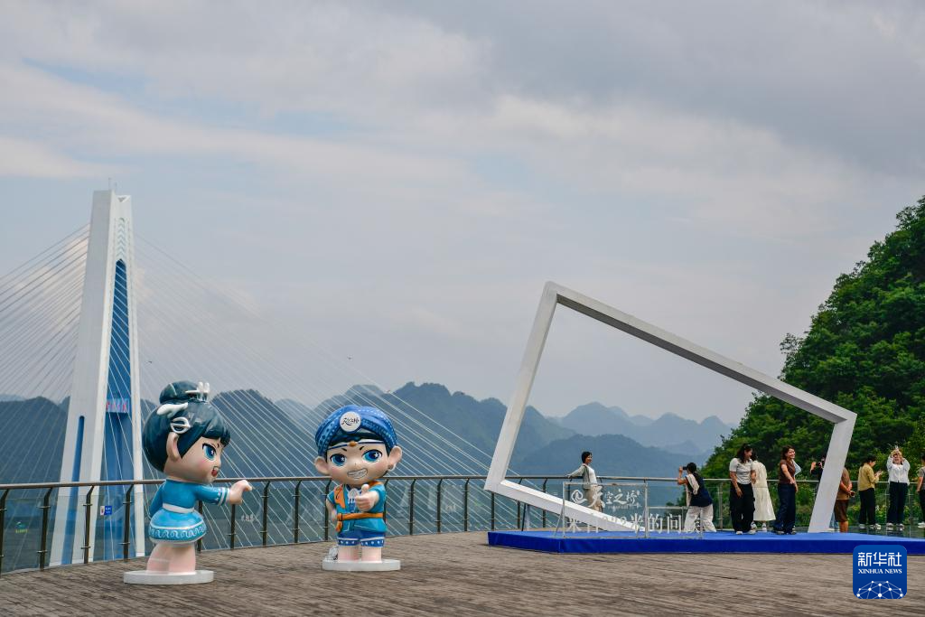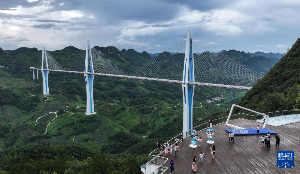 7月11日,游客在贵州省平塘县“天空之桥”服务区观景平台留影。