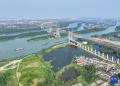 这是沪渝蓉高铁跨京杭运河斜拉桥施工现场(7月13日摄,无人机照片)。