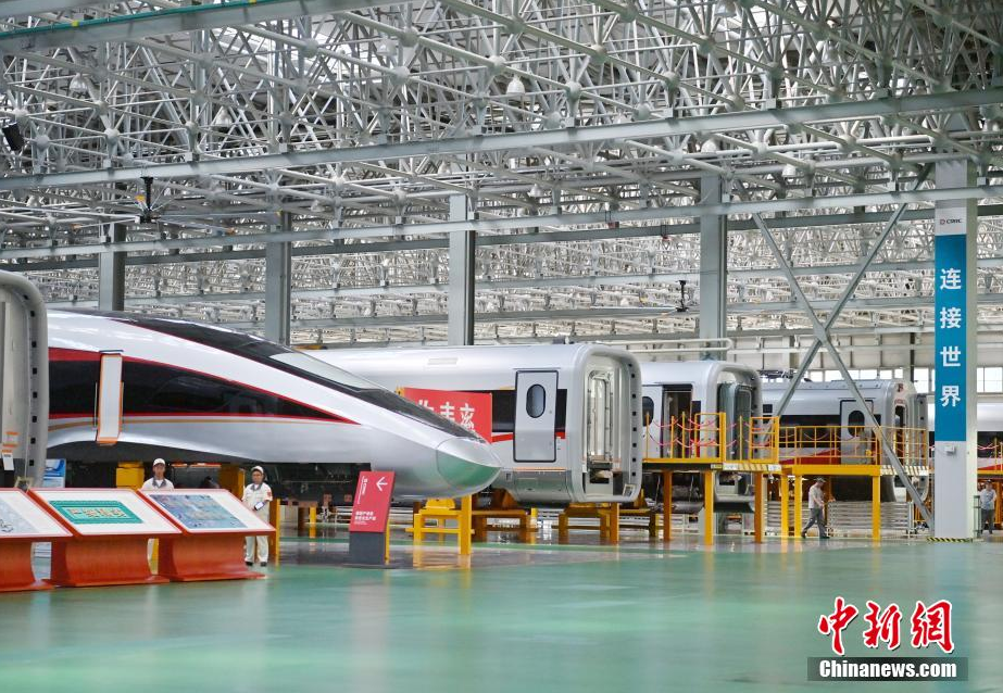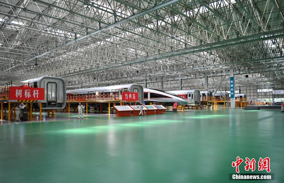 7月14日,2025年“活力中国调研行”采访团参观位于吉林省长春市的中车长客股份公司。该公司是中国地铁、动车组和磁浮列车的摇篮,目前已构建了具有国际领先水平的动车组、地铁、磁浮列车等9大产品平台30个主型产品,累计研发CR450动车组、时速600公里新一代常导、超导磁浮列车及中低速磁浮、氢能源市域列车等新产品140余种,形成全类型、全品种轨道交通产品研制能力,以高端产品为代表的国际业务合作已遍布全球六大洲、20多个国家和地区。图为中车长客股份公司国铁事业部装配产线。中新社记者 张瑶 摄