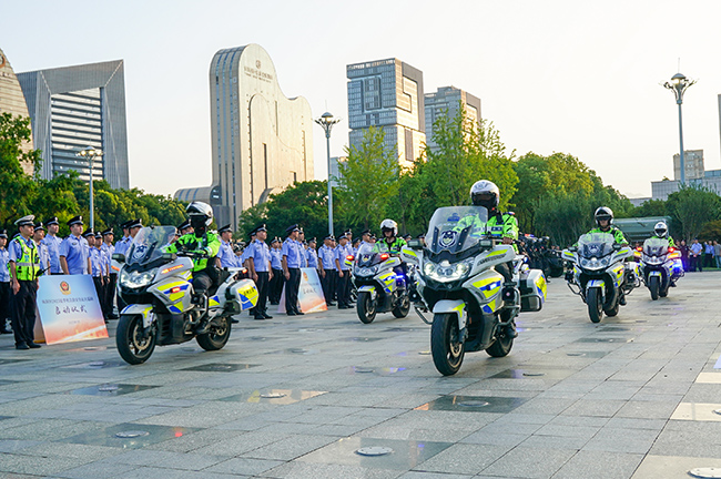 现场气氛高涨,由瓯海区级机关、派出所、特巡警、交警、应急消防、镇街干部、社工平安联盟志愿者等组成的7支方队约400人整装待发、精神焕发;汽车编队、摩托车编队与无人机编队集结列队,严阵以待,向瓯海全区人民彰显出铸牢夏季平安铜墙铁壁的坚定信念。