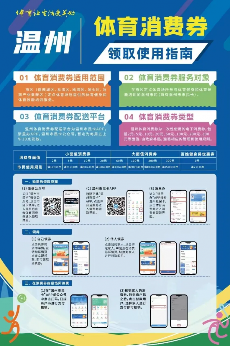 温州网讯 温州市近日正式启动2025年暑期市区体育消费券惠民活动,市民可以通过“温州市民卡”公众号、“温州市民卡”APP或“浙里办”APP进入消费券领取界面。本次活动支持市民为14周岁以下及60周岁以上的家人代领。抢券活动为每周五上午10点开放,活动将一直维持到8月29日。