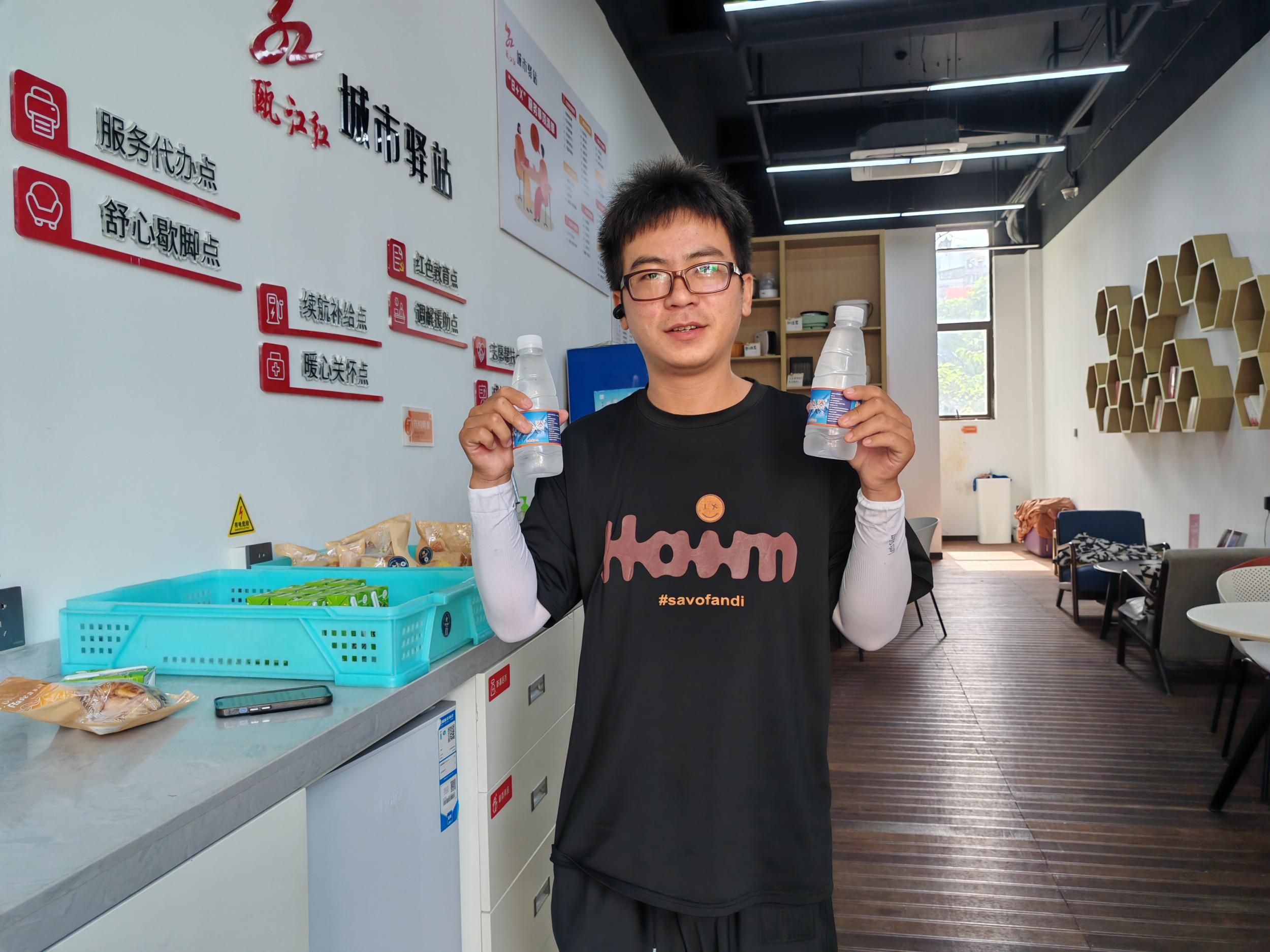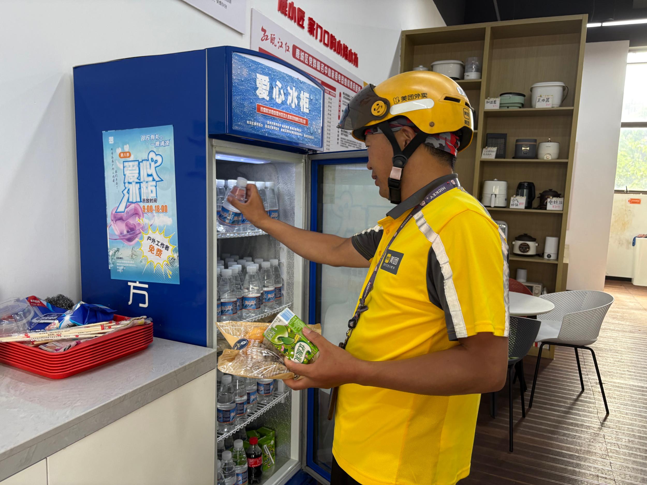 外卖小哥在城市驿站鹿城总站的爱心冰柜点位取水喝。
