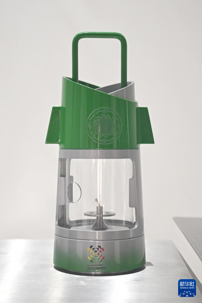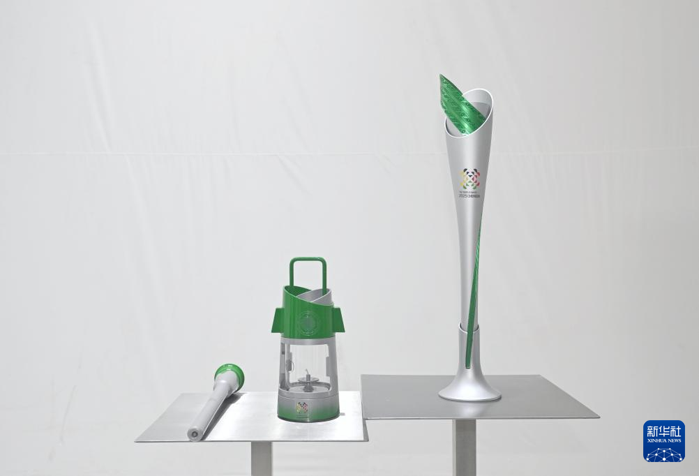 这是7月16日拍摄的采火棒(左)、火种灯(中)和火炬。当日,成都世运会火炬传递系列装置(火炬“竹梦”、火种灯、采火棒、采火器、火种盆等)亮相。新华社记者 刘坤 摄