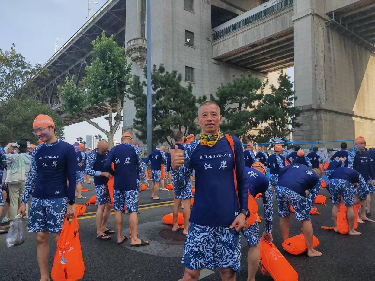“我年轻时偶尔游,退休了恨不得天天泡在江里。”63岁的周崇俭在江中游过20多年,对长江两岸的变化感触颇深。他曾与朋友从武汉中山舰轮渡旅游码头顺流而下,一口气游了七个多小时,游过50公里、9座长江大桥。“城市发展太快了。1995年时,武汉还只有两座跨江大桥。”