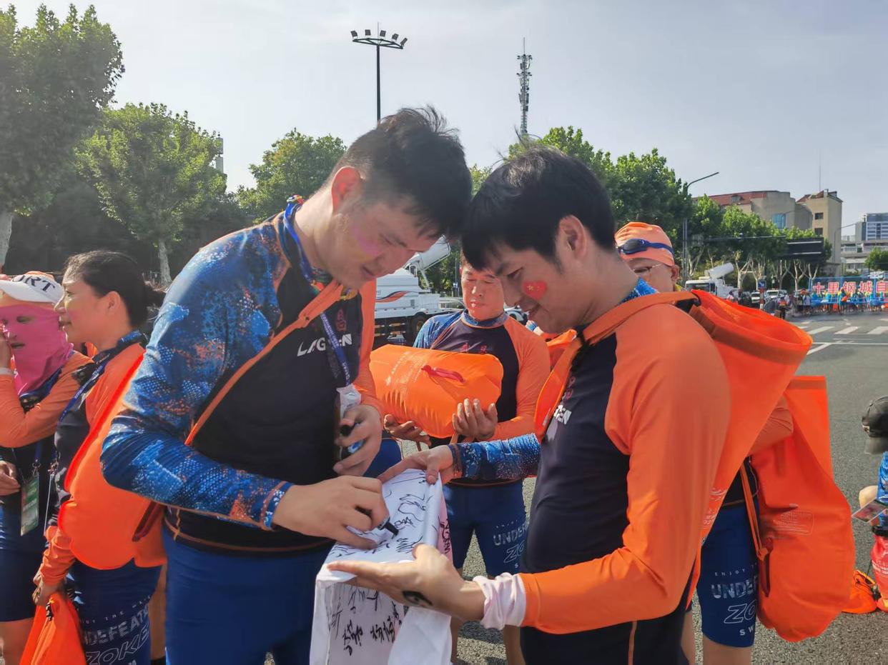 候场时,37岁的付艳球拿出一件白色T恤,收集队友们的签名。他准备将这件纪念衫与渡江的泳帽、泳衣一起装进相框,永久珍藏。“人到中年,我经历了不少生死离别,也要面对很多现实压力,有时候觉得自己很需要精神支撑,而渡江给了我这种力量。”