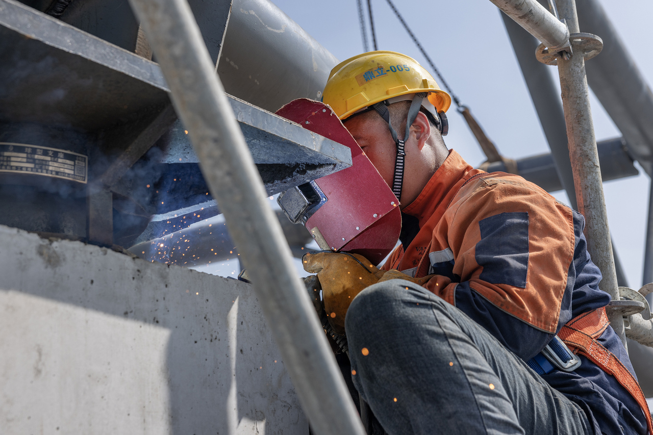 园博园项目现场,工人们趁早赶工。共享联盟·瓯海 陈明铭 摄