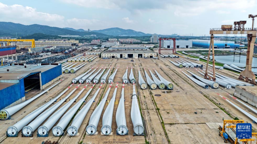 7月17日在山东省荣成市石岛管理区海上风电产业基地拍摄的大型风电叶片(无人机照片)。