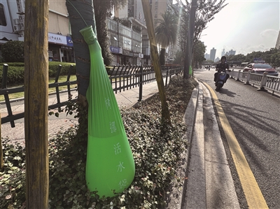 温州网讯 昨日,市区百里路上数十棵人行道树木挂着绿绿的“点滴”补水,在阳光的照射下特别醒目。该补水袋为15L容量的可调节微灌保湿袋,一袋水可用上10天左右。用这种方式补水,不但有效补水、养护增效,还能节水环保、节约人工,也不会影响城市绿化的美观度。