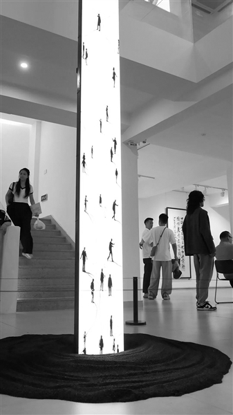 展厅中,“百花齐放”的策展理念扑面而来。展览打破了以往单一艺术门类的限制,书法、国画、油画、数字媒体艺术等多种形式交相辉映。空间设计也别具匠心:一楼中厅,联合策展人,中国美术学院公共空间艺术系副主任阮悦来的数字影像装置以瀑布倾泻、潮水奔涌的动态画面震撼开场;二楼挑高空间陈列着充满现代气息的雕塑与交互作品,四楼橱窗展厅则在柔和灯光下烘托传统水墨与书法的韵味。