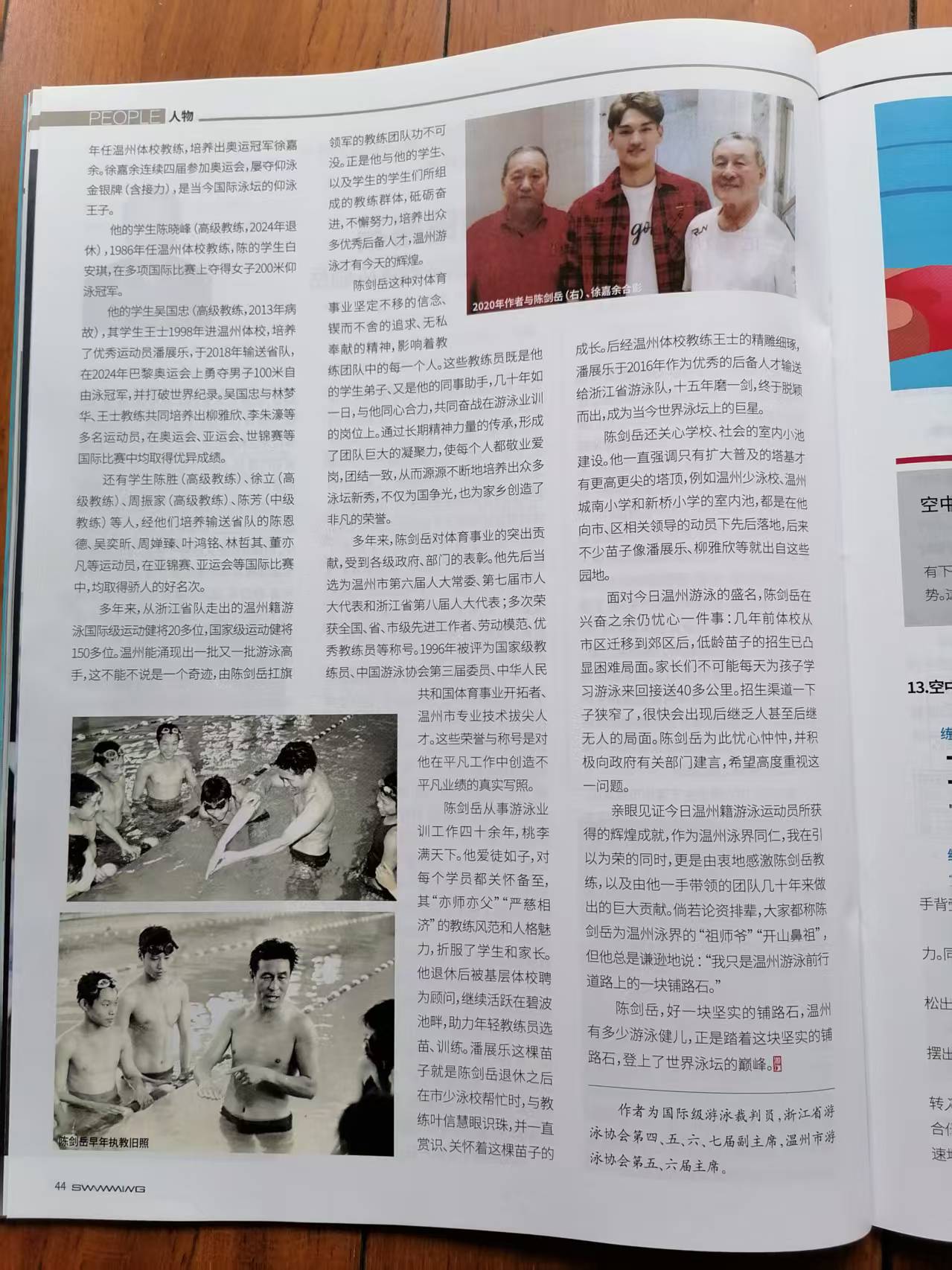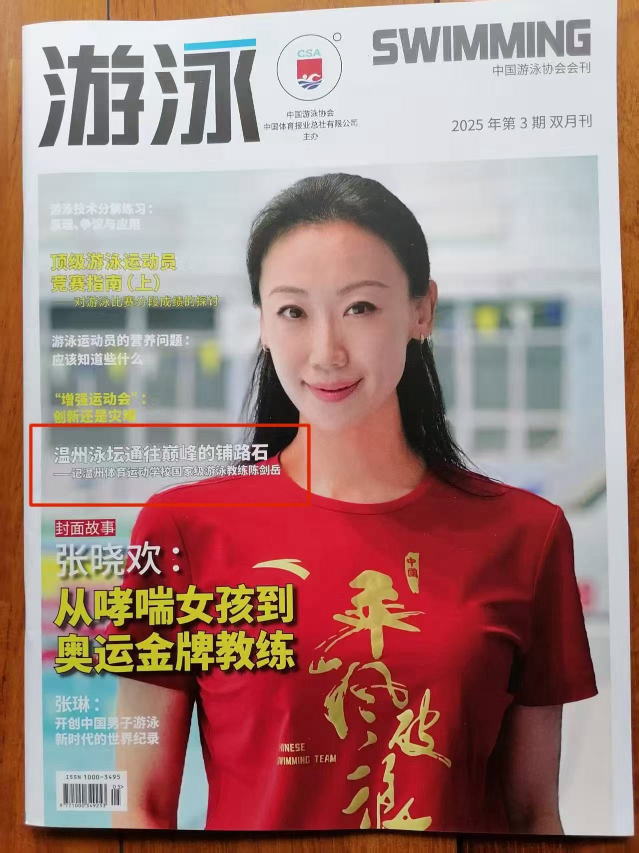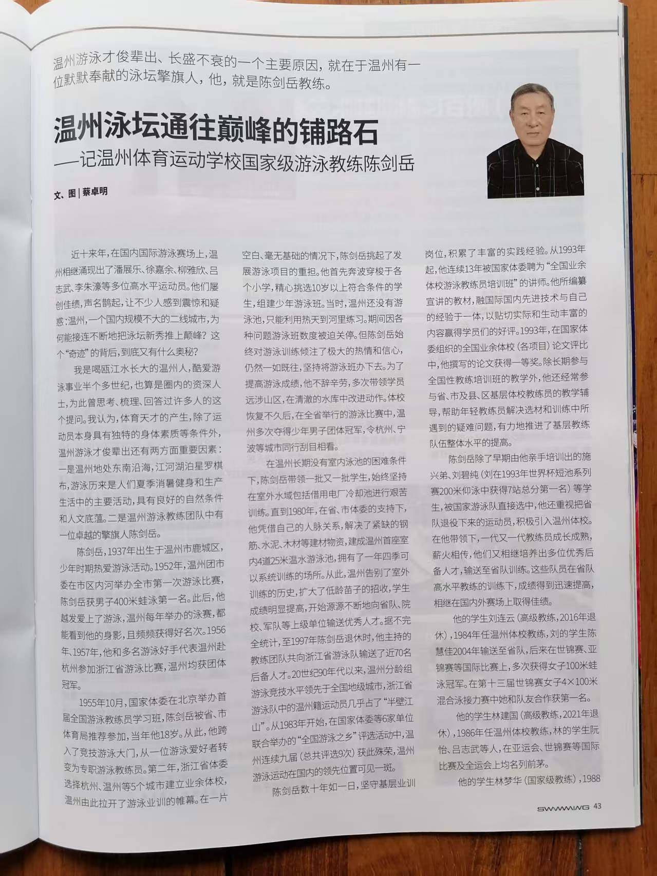 6月底,由中国游泳协会、中国体育报业总社有限公司主办的权威杂志《游泳》2025年第3期刊发了《温州泳坛通往巅峰的铺路石——记温州体育运动学校国家级游泳教练陈剑岳》一文,作者为国际级游泳裁判员,浙江省游泳协会第四、五、六、七届副主席,温州市游泳协会第五、六届主席蔡卓明。