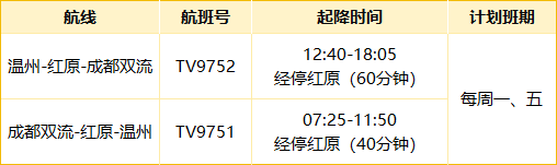 7月21日,温州至红原航线开始复航。按照计划,该航线将由西藏航空运营,班期为每周一、五,TV9752/温州至红原航班的起飞时间为12:40,TV9521/红原至温州航班的抵达时间为11:50。这是浙江省与阿坝州之间唯一一条空中航线。