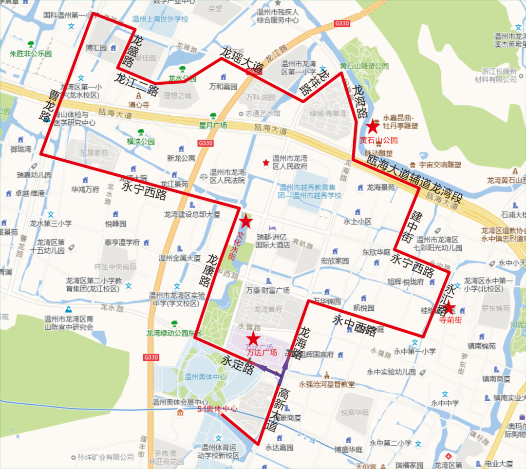 1线:S1奥体中心首末站始发,沿途设S1奥体中心、万达广场东、万华锦园、黄石山公园、海棠湾东、龙湾区一小、万和嘉园、宏周桥、龙水一小、东林、万鸿嘉园、龙江景苑、万达广场南、S1奥体中心,至S1奥体中心首末站(环线)。