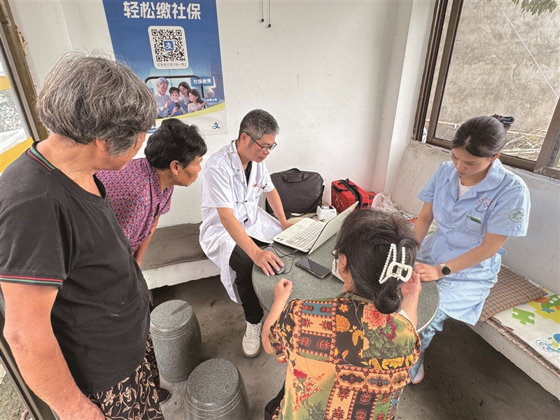 当天下午换班的是章建治医生,记者跟随他去了两个巡回诊疗点,每个诊疗点都有20多名村民在等候。一位70多岁的老太太拿着丈夫的病历资料,请医生帮忙调整慢病用药处方,医生看了医保卡的姓名后说,“这个老人多年来行动不便,我们有定期上门诊疗。”诊疗结束后,章建治带着记者爬山路,入户给老人进行面诊。