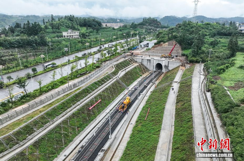 7月22日,在贵州省盘州市茶厅左线隧道出口施工现场,随着最后一对500米长钢轨稳稳落下,贵州盘州至兴义铁路全线铺轨工程圆满完成。该铁路全长约98公里,自沪昆客专盘州站引出,经盘州市石桥镇、响水镇、保田镇,进入兴义市,是贵州省“市市通高铁”的最后一个项目。图为铺轨现场。(无人机照片)中新社记者 瞿宏伦 摄