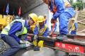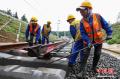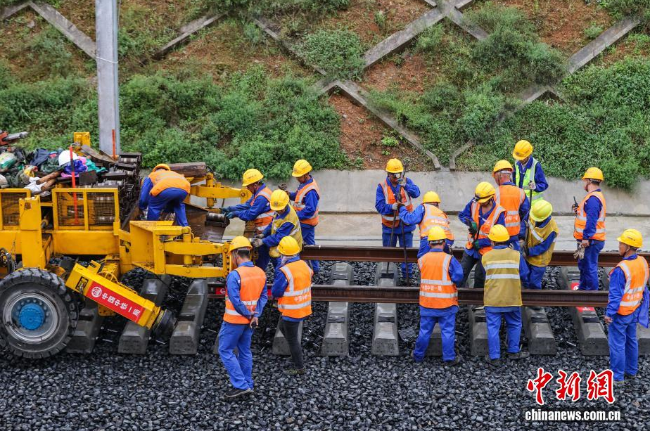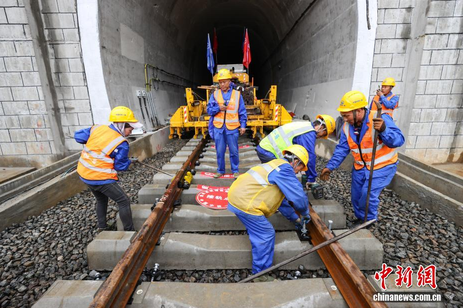 7月22日,在贵州省盘州市茶厅左线隧道出口施工现场,随着最后一对500米长钢轨稳稳落下,贵州盘州至兴义铁路全线铺轨工程圆满完成。该铁路全长约98公里,自沪昆客专盘州站引出,经盘州市石桥镇、响水镇、保田镇,进入兴义市,是贵州省“市市通高铁”的最后一个项目。图为工人在铺轨。中新社记者 瞿宏伦 摄