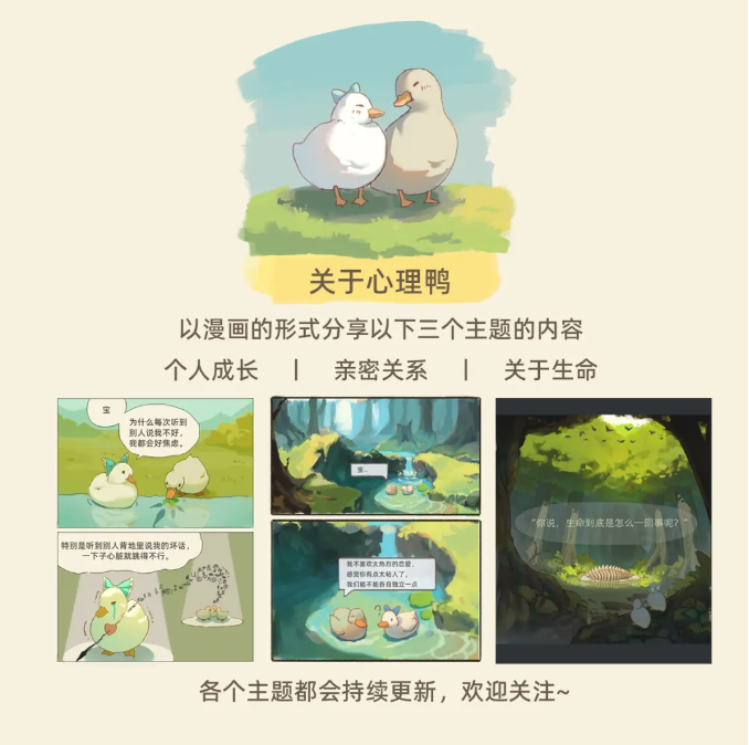 为何选择一只小白鸭作为情感代言人?鸭妈妈带小鸭子的场景天然带有亲切感,特别适合初期对亲子关系的探讨。”阿惠的答案充满巧思,“相比表情丰富的猫狗,小鸭子内敛的神态恰恰适合情感类内容的叙事氛围。它自带沉思气质,让读者能自然投射自己的情绪。”同时,比起猫狗,小鸭子这一相对少见的形象,也能避免陷入同质化,更容易让观众记住。