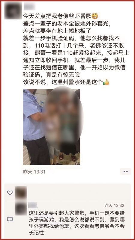 温州网讯 “今天差点一辈子的老本,全被她外孙套光了。110电话打十几个来,就差最后一步,真是有惊无险!”近日,温州一位家长发了一条朋友圈,142字的内容里“差点”二字反复出现,字里行间满是对电信网络诈骗的后怕,以及对温州警方反诈工作的点赞。朋友纷纷留言评论:“看得我好紧张。”“真替她捏把汗!”