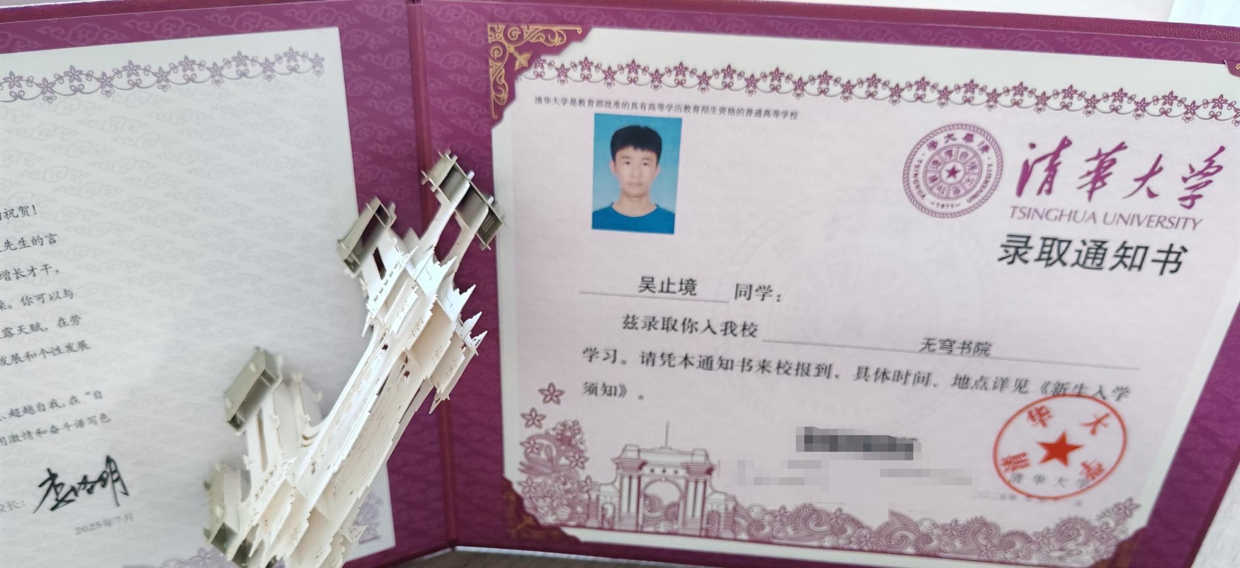 考上清华大学是吴止境进入高中就确定的目标,录取通知书显示,他将入读清华大学无穹书院,该书院是清华大学今年新成立的四个书院之一,面向计算、人工智能领域,这也是他最喜欢的方向。小吴告诉记者,进入大学后他将继续努力,持之以恒,实现自己更大的梦想,追求无止境!